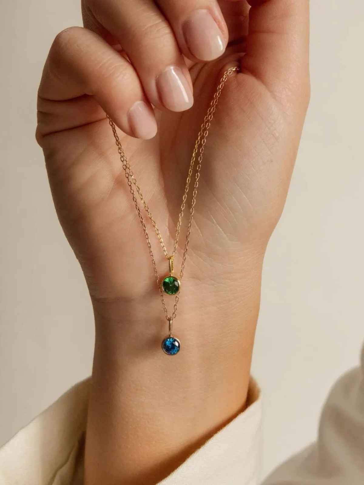 Discover ESSENZA, our personalised birthstone necklace. Choose between gold or silver and add a coloured stone for a unique touch.