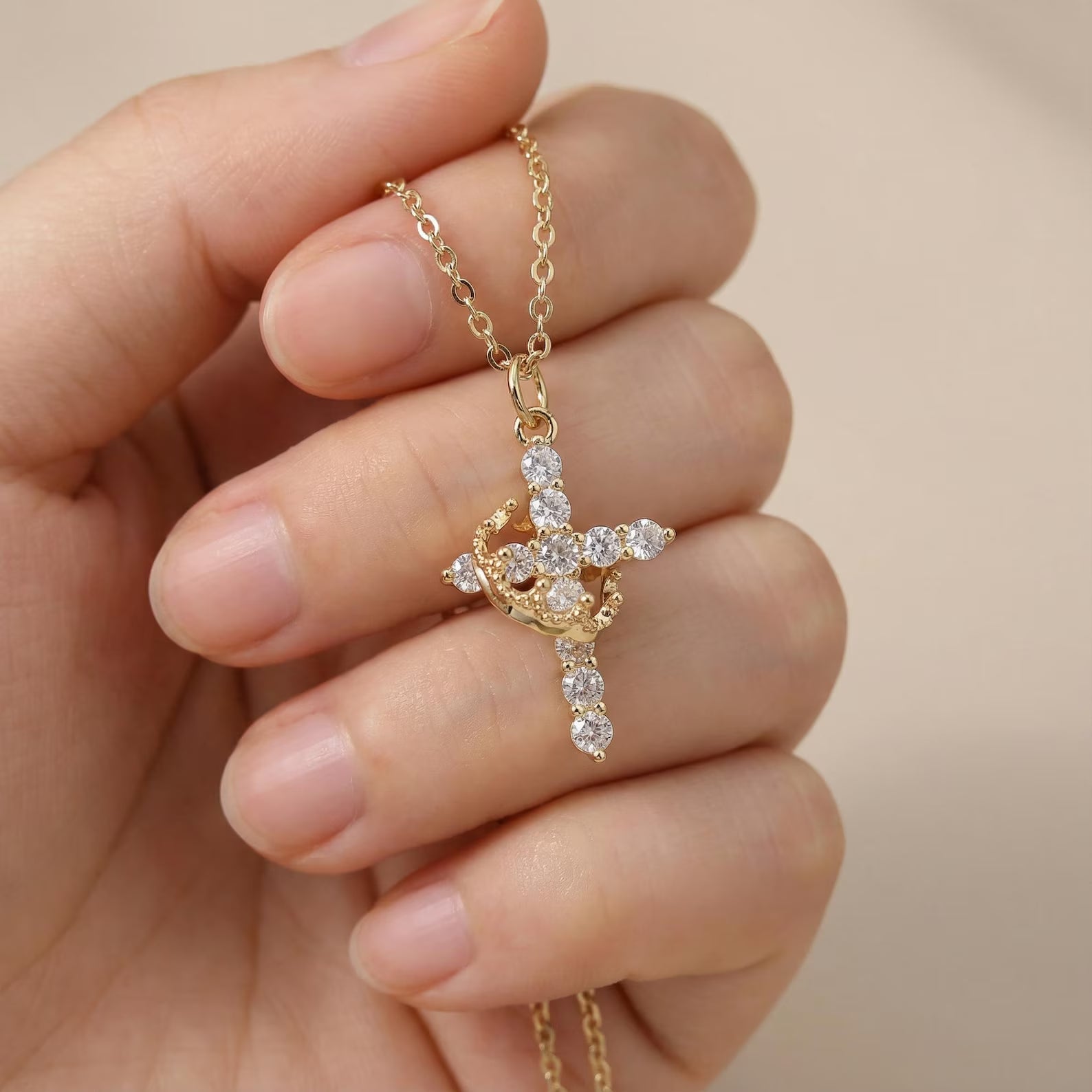 Symbol of devotion and inner strength, this gold-plated cross and crown pendant is adorned with luminous zircon stones that capture the light with every movement. Designed to reflect both faith and elegance, it discreetly reminds you to keep your convictions close, with grace, confidence, and determination.